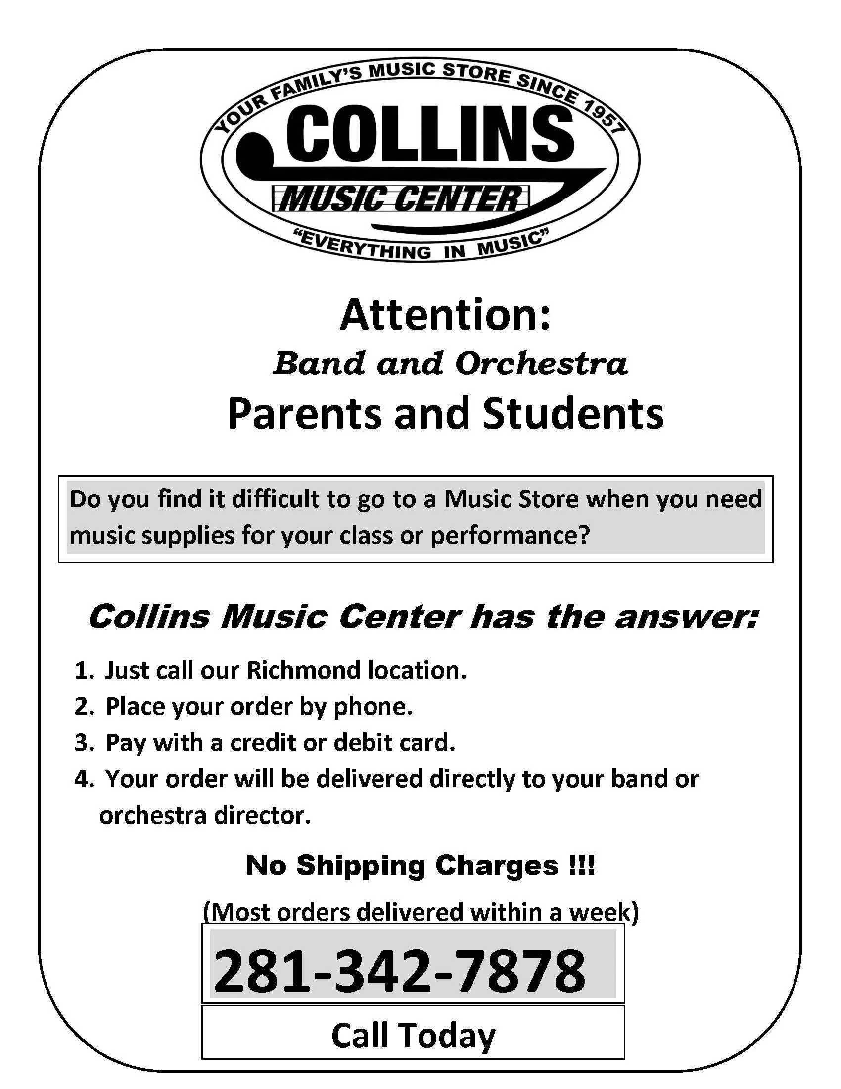 For instrument accessories such as reeds, oil, and other items you can now order from Collins Music Co. over the phone and the supplies will be delivered to the school so you do not have to pick them up! Ask a band director or call the store to give it a try!